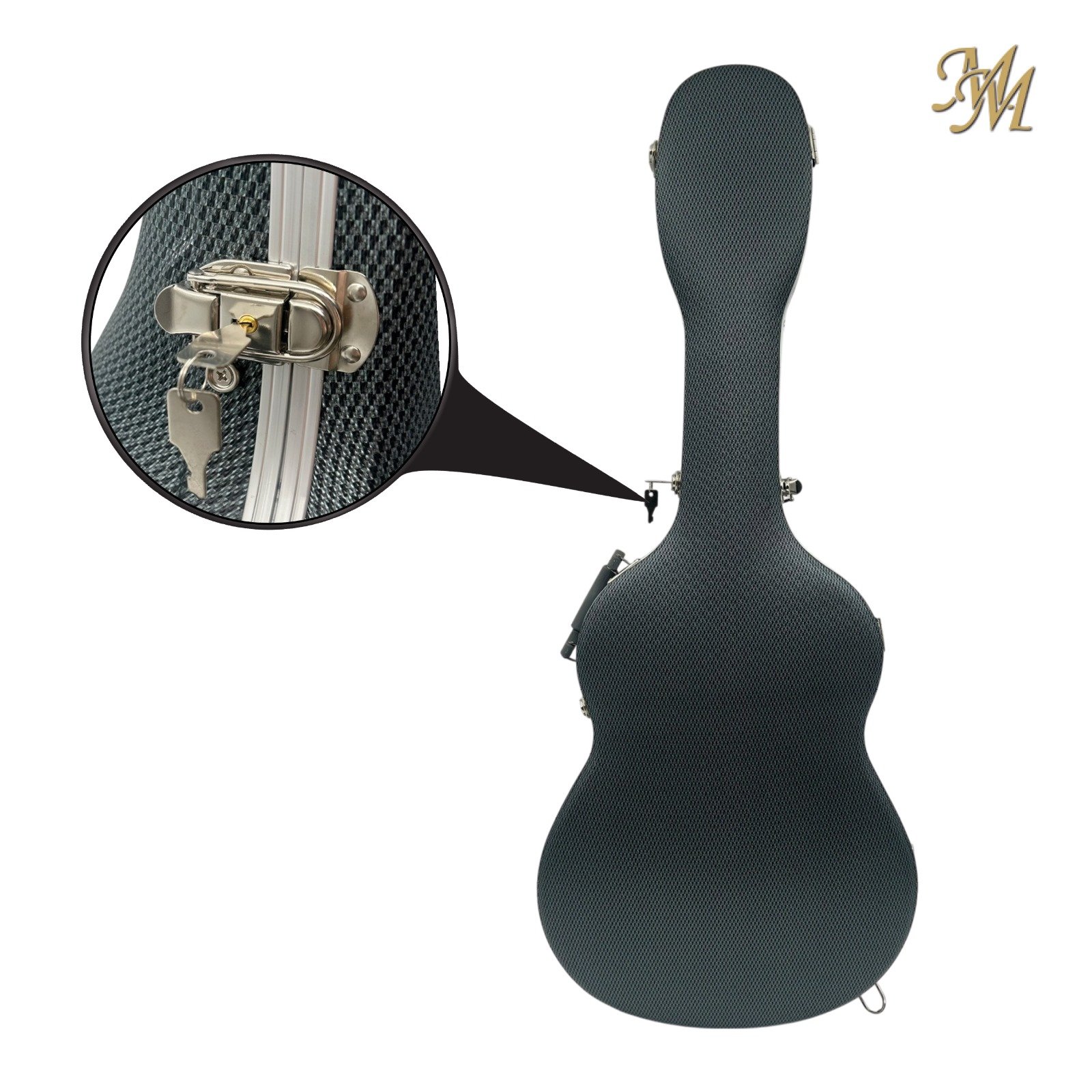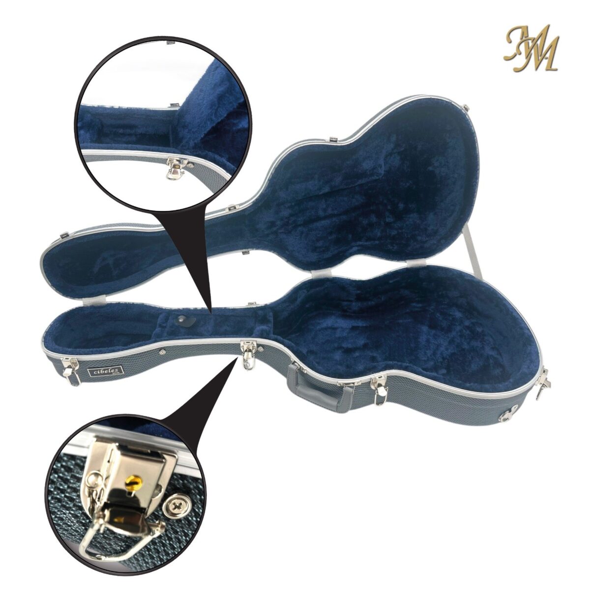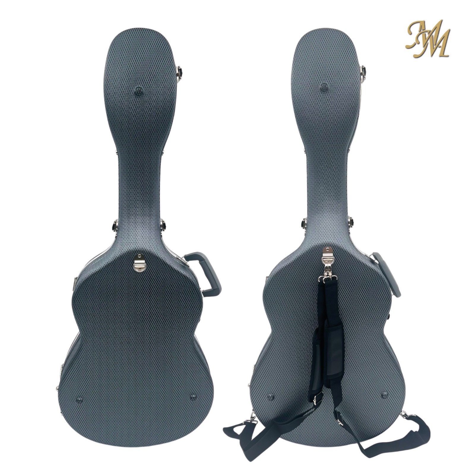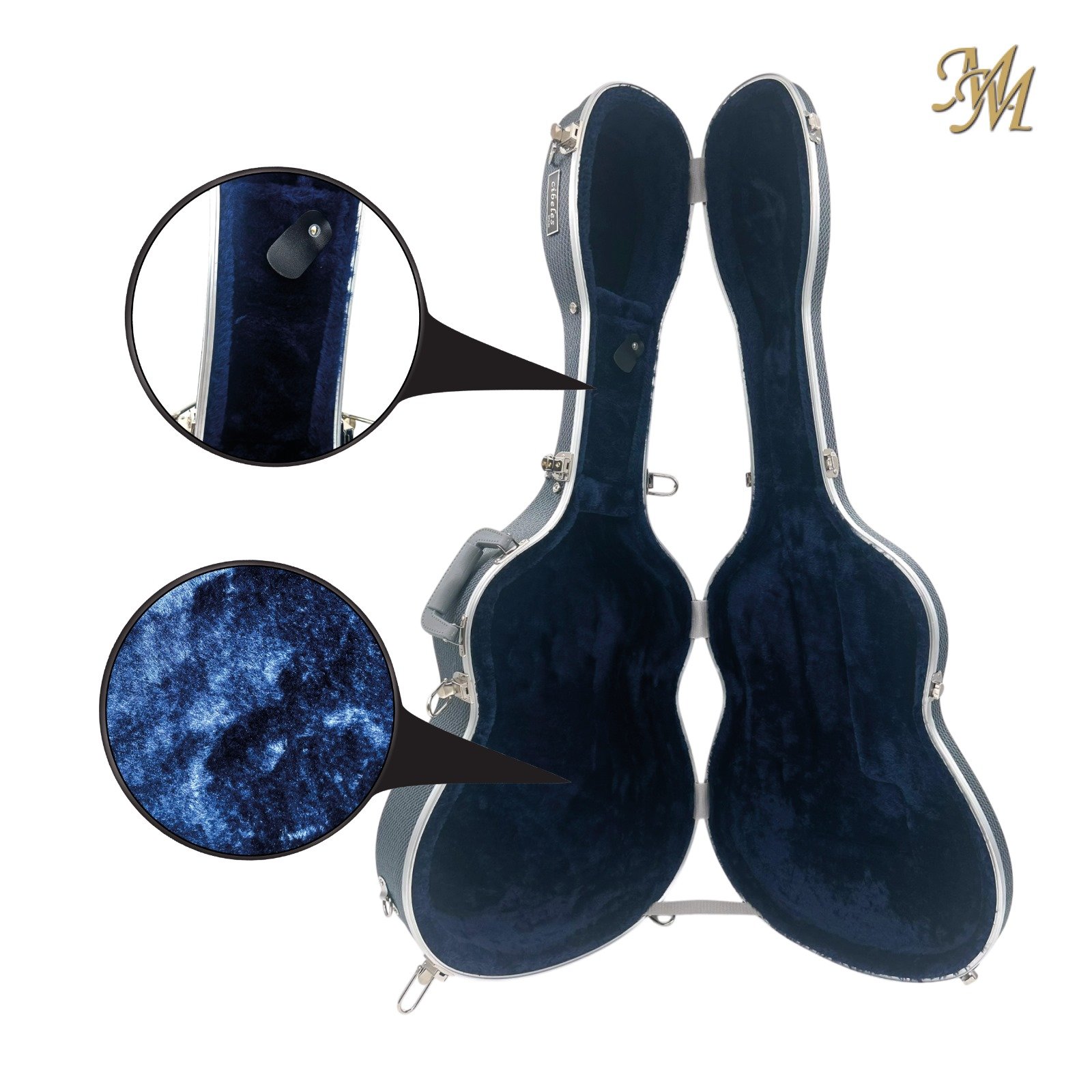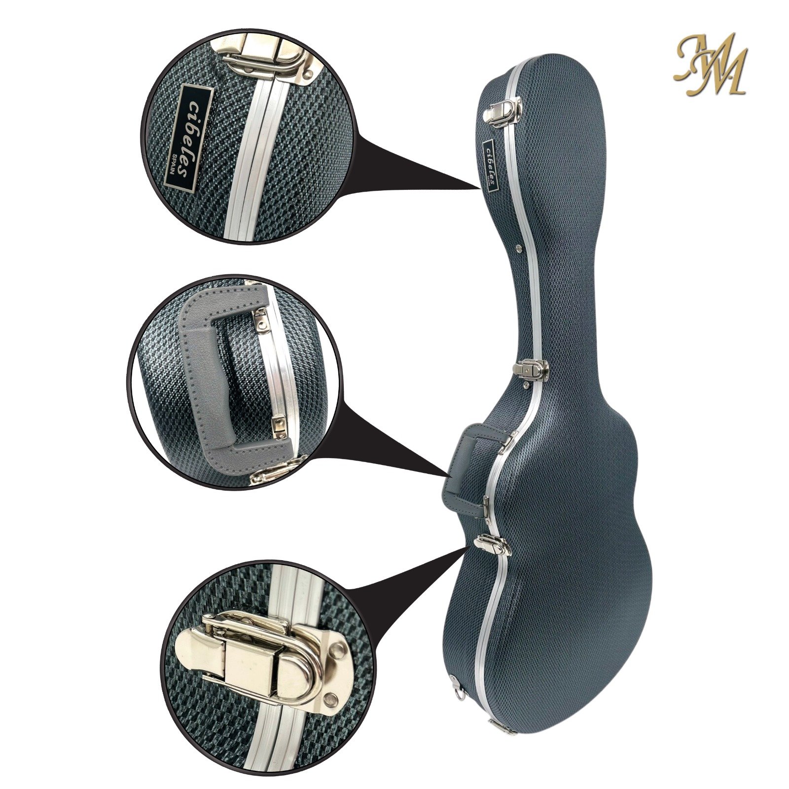 Rígido, ABS y carbono, con correas y herrajes cromados, asa, tiras para mochila incluidas. Interior de lujo en terciopelo.