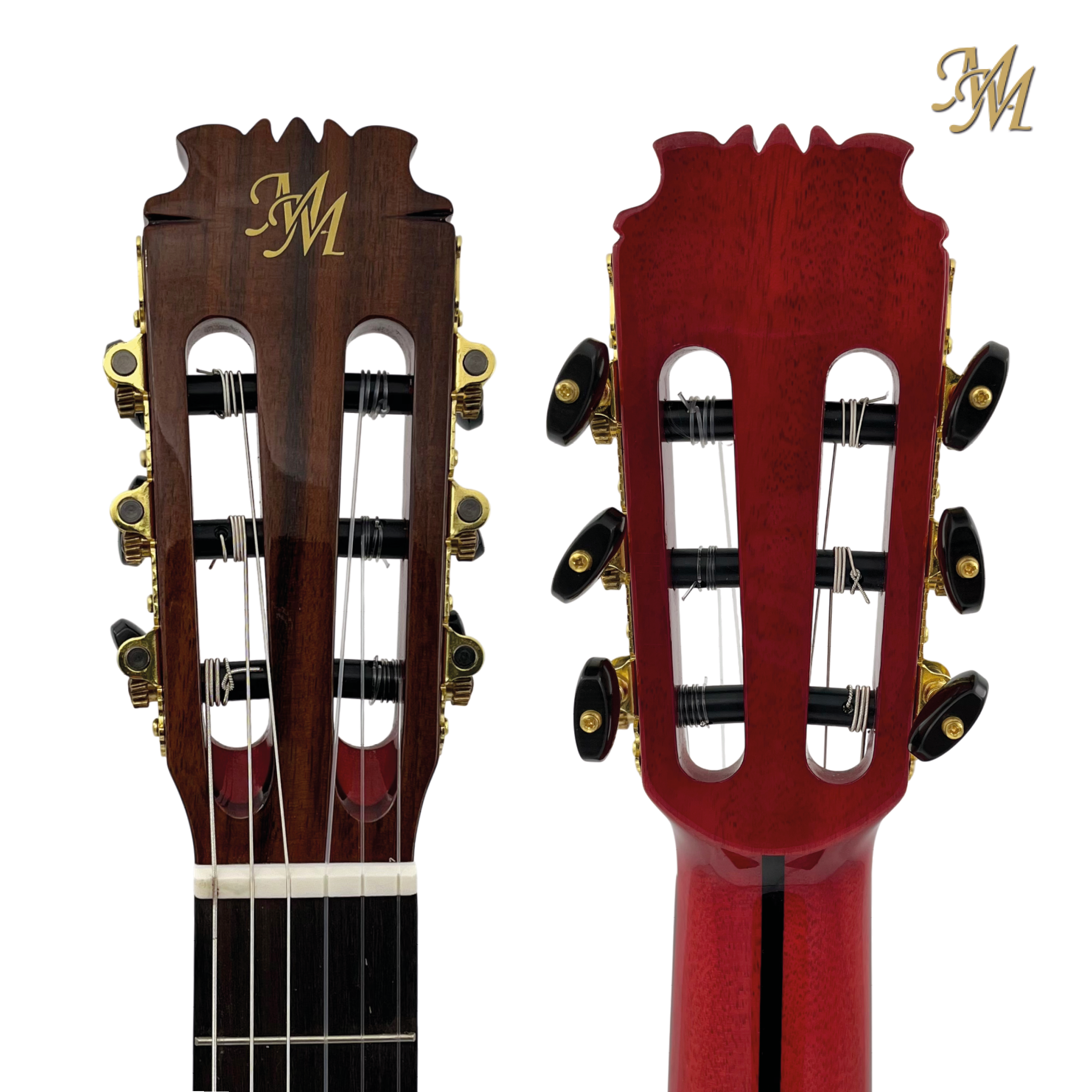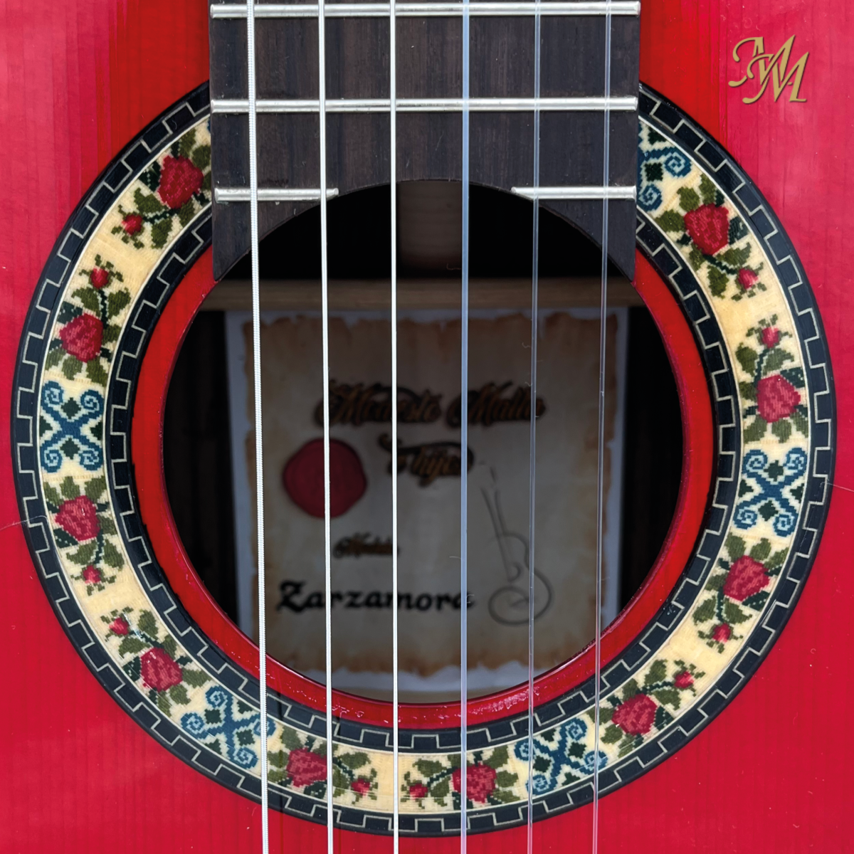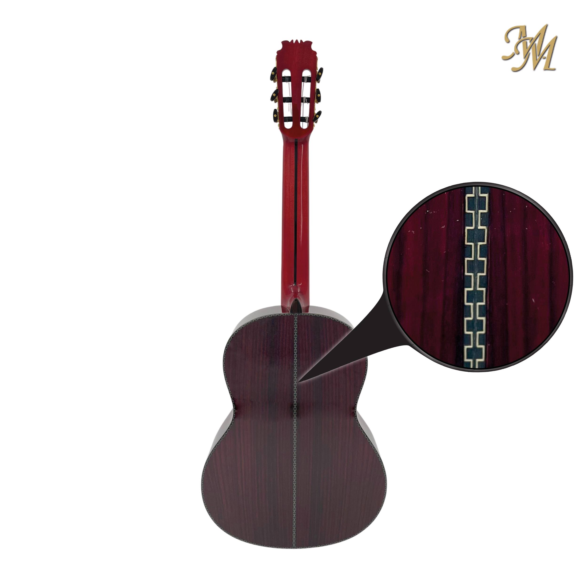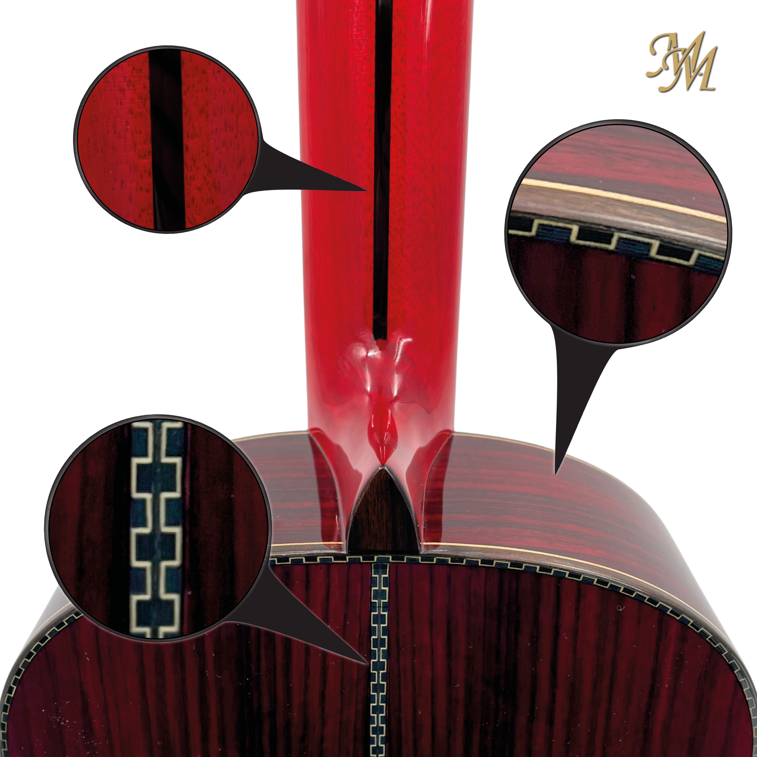 Su roseta elegante y de aire flamenco recuerda a las grandes guitarras. Gracias a su construcción especial, ofrece una tensión equilibrada, acción baja y comodidad, con un sonido profundo, poderoso y lleno de matices, que combina brillo, proyección y calidez propios del palosanto.