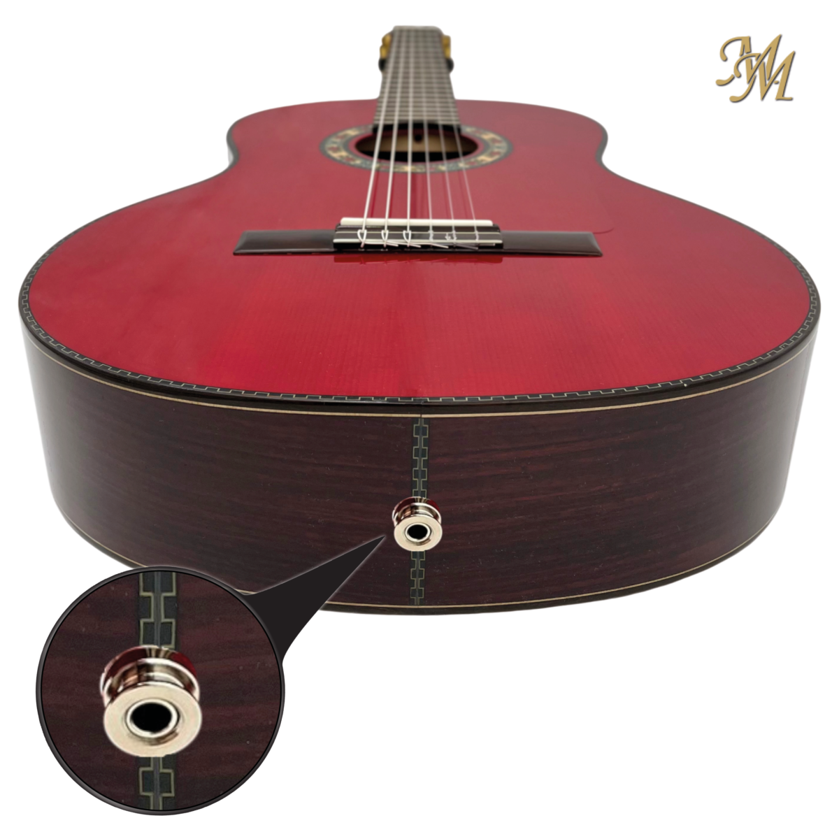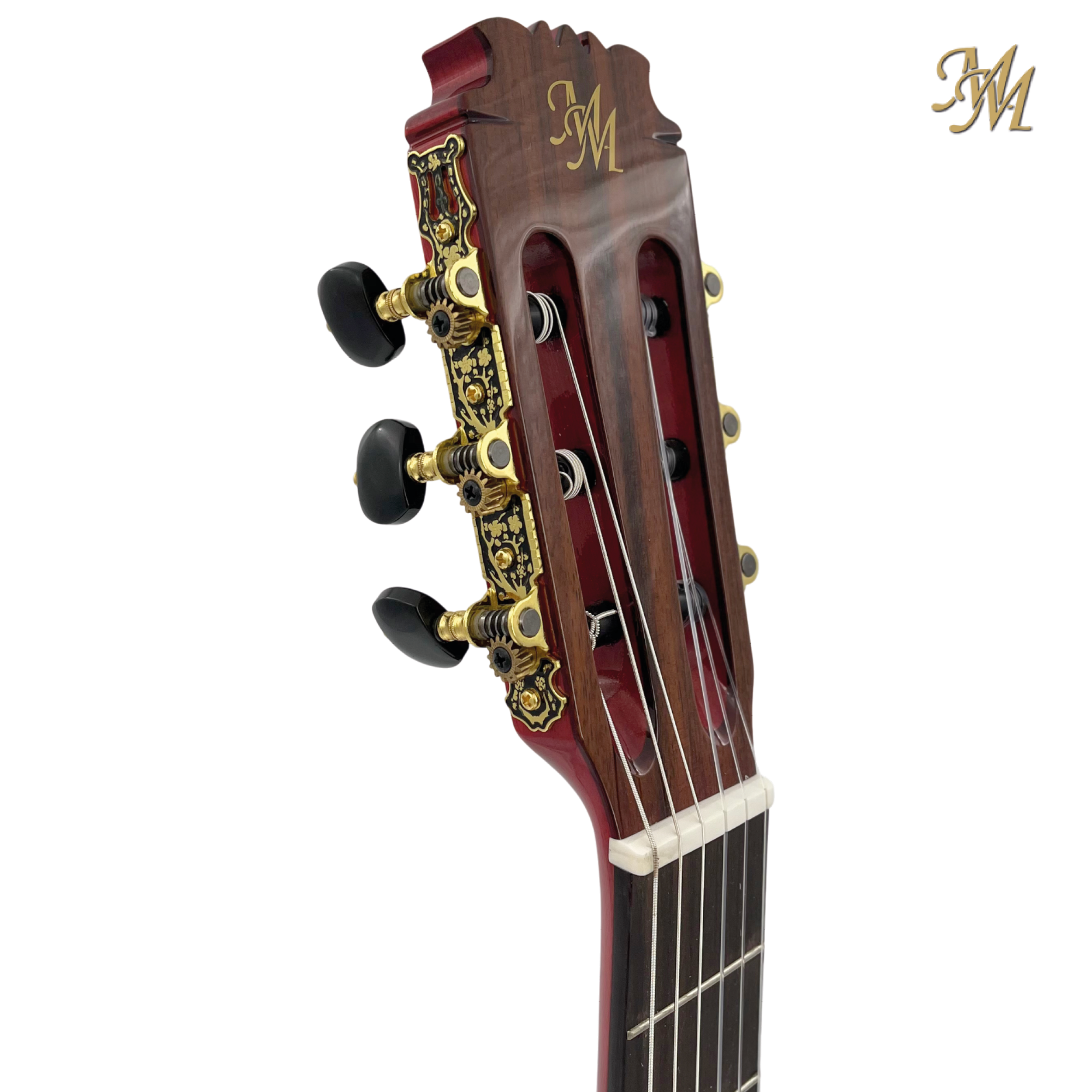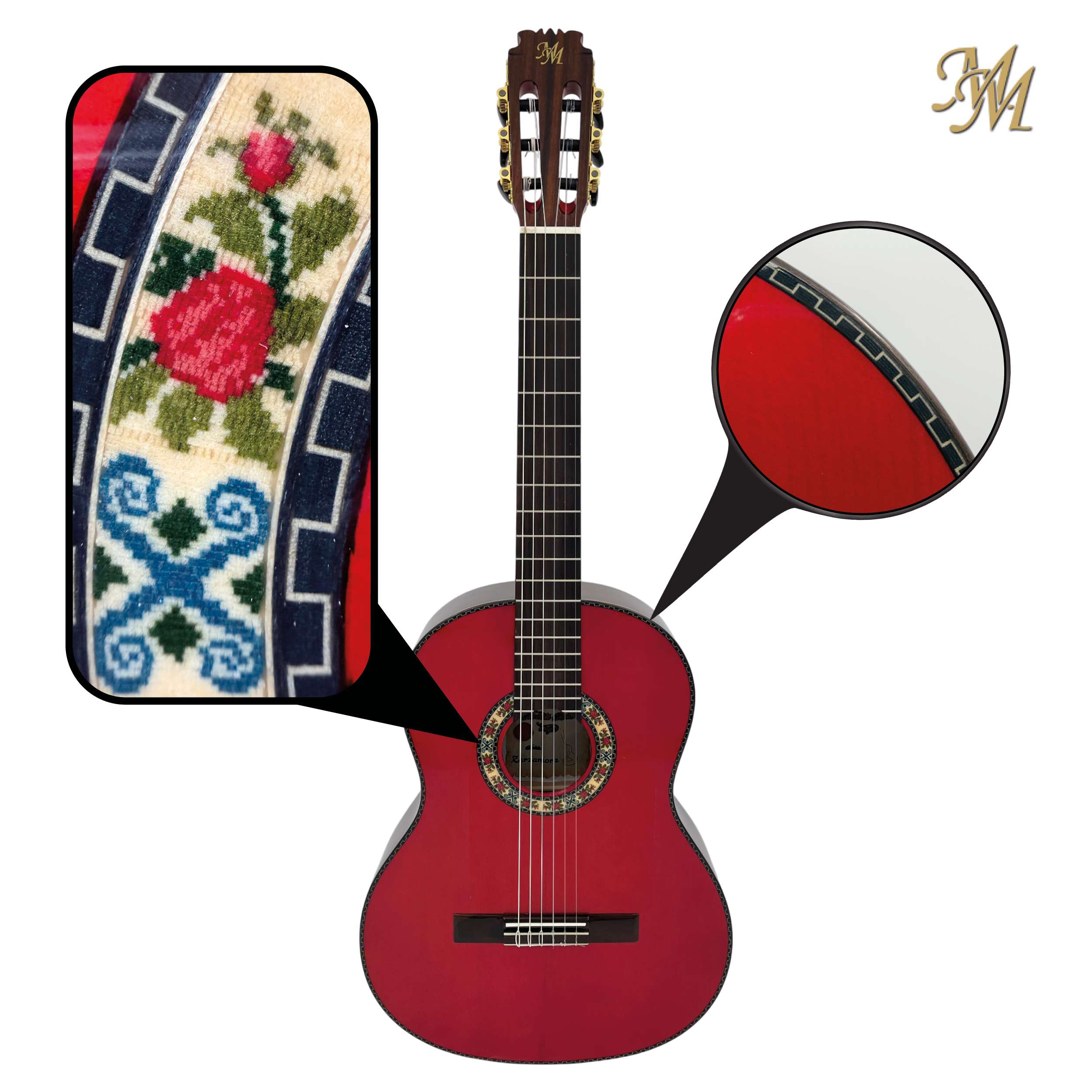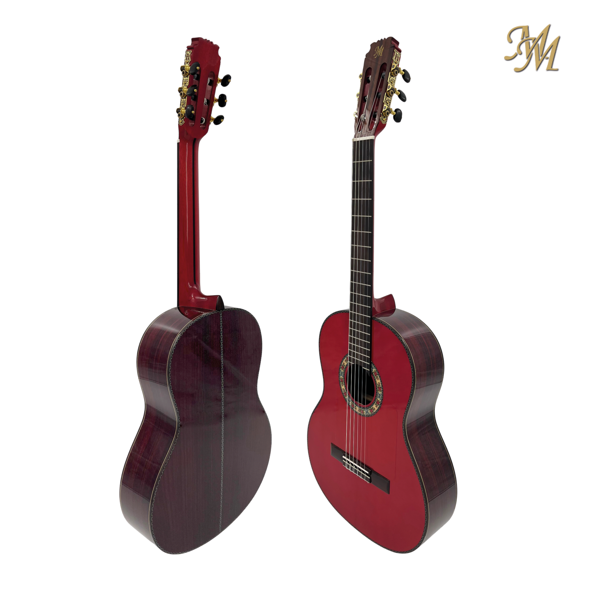 Su roseta elegante y de aire flamenco recuerda a las grandes guitarras. Gracias a su construcción especial, ofrece una tensión equilibrada, acción baja y comodidad, con un sonido profundo, poderoso y lleno de matices, que combina brillo, proyección y calidez propios del palosanto.